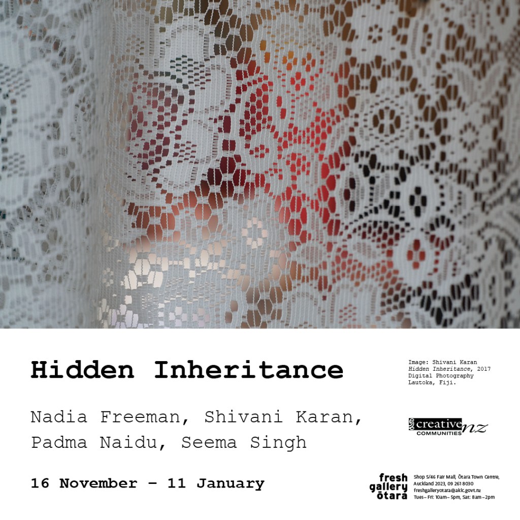 I’m super proud to have worked with Shivani Karan to curate Hidden Inheritance. This is an exhibition at Fresh Gallery in Ōtara until March 11. Featuring the work of a collective of Fijian Indian artists including myself, Shivani Karan, Padma Naidu and Seema Singh who have made works with the intention of exploring the diaspora of our Girmit history.